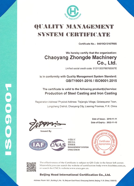 朝陽中德機械有限公司座落于有著“東方佛都”之稱的三燕古都,歷史文化名城——朝陽,具體位置朝陽市龍城區七道泉子鎮鐵匠爐村。公司創建于2006年5月是一家以鑄鋼件、鑄鐵件,集按用途設計、開發、生產、銷售于一體的,為機械設備配套的生產型公司。公司注冊資金1000萬,固定資產投資1480萬元,主要生產設備GGW-5T,GGW-10T,GGW-10T中頻感應爐;GDY-13C高溫電阻窯、GDY-9.5C電阻窯,M4000型直讀光譜儀,DP-3985型硬度測試儀,倒置式金相顯微鏡、拉伸試驗機、超生波探傷儀,檢測手段完備。